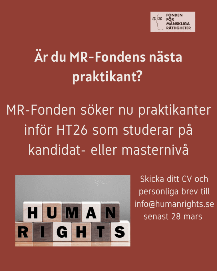 Som praktikant hos oss erbjuds du en spännande arbetsplats där du får ta del av det nationella och internationella arbetet som sker inom en människorättsorganisation. Till höstterminen 2026 söker vi två MR-praktikanter. Vi söker dig som närmar dig slutet av dina studier inom mänskliga rättigheter, fred och konflikt, juridik med fokus på folkrätt eller liknande relevant utbildning.